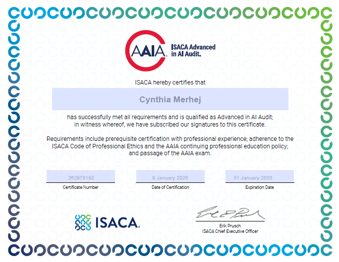 Cynthia Merhej is an AI advisor, educator, and auditor driven by a simple belief: technology should serve people, not replace them. With a Master’s in Artificial Intelligence and certifications spanning CPA, CISA, ISO 9001 & 27001, Certified AI Auditor, and IT Expert in AI, she brings rare depth at the intersection of AI, governance, and human values.